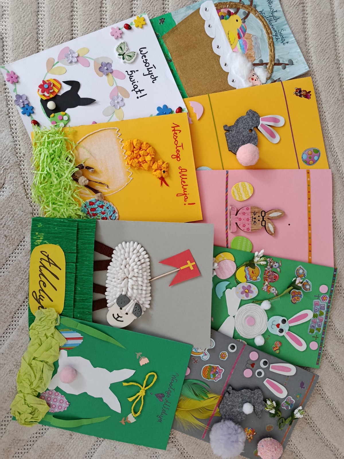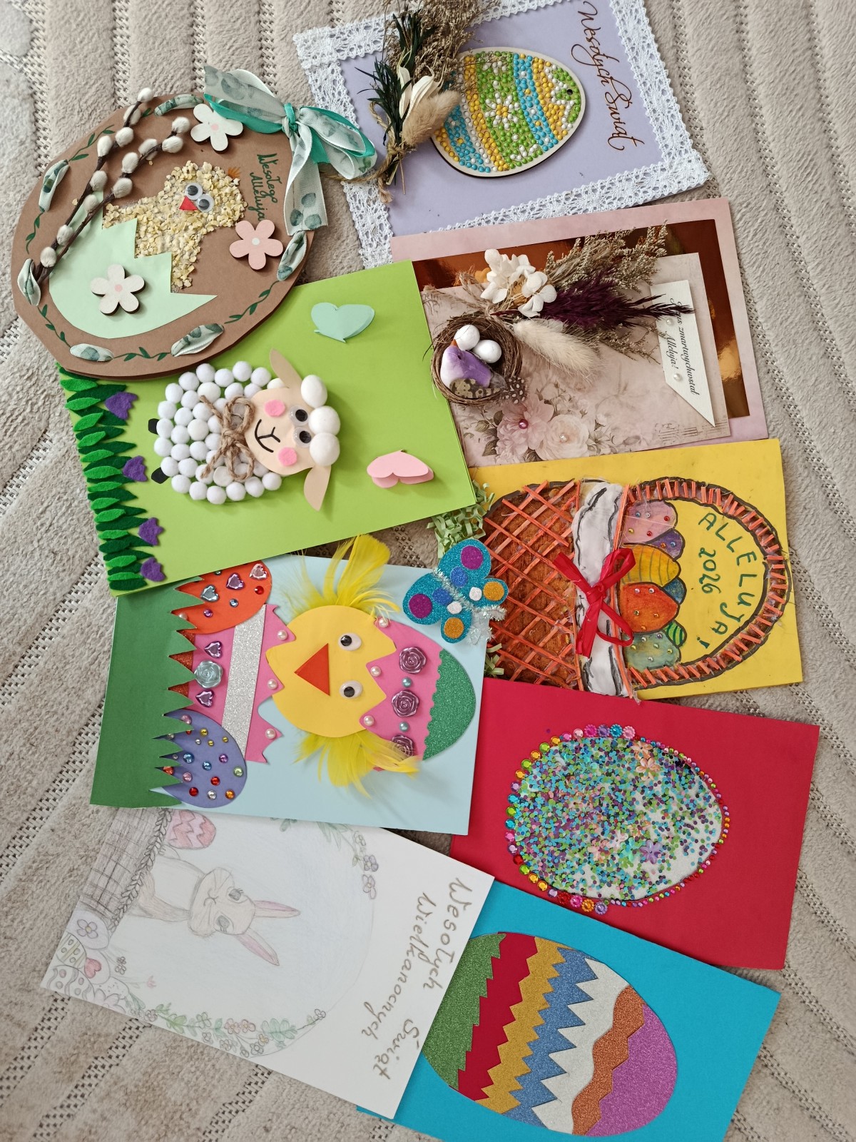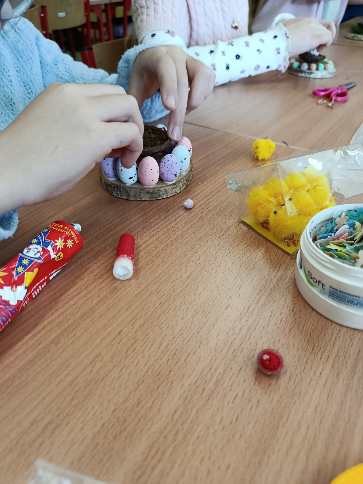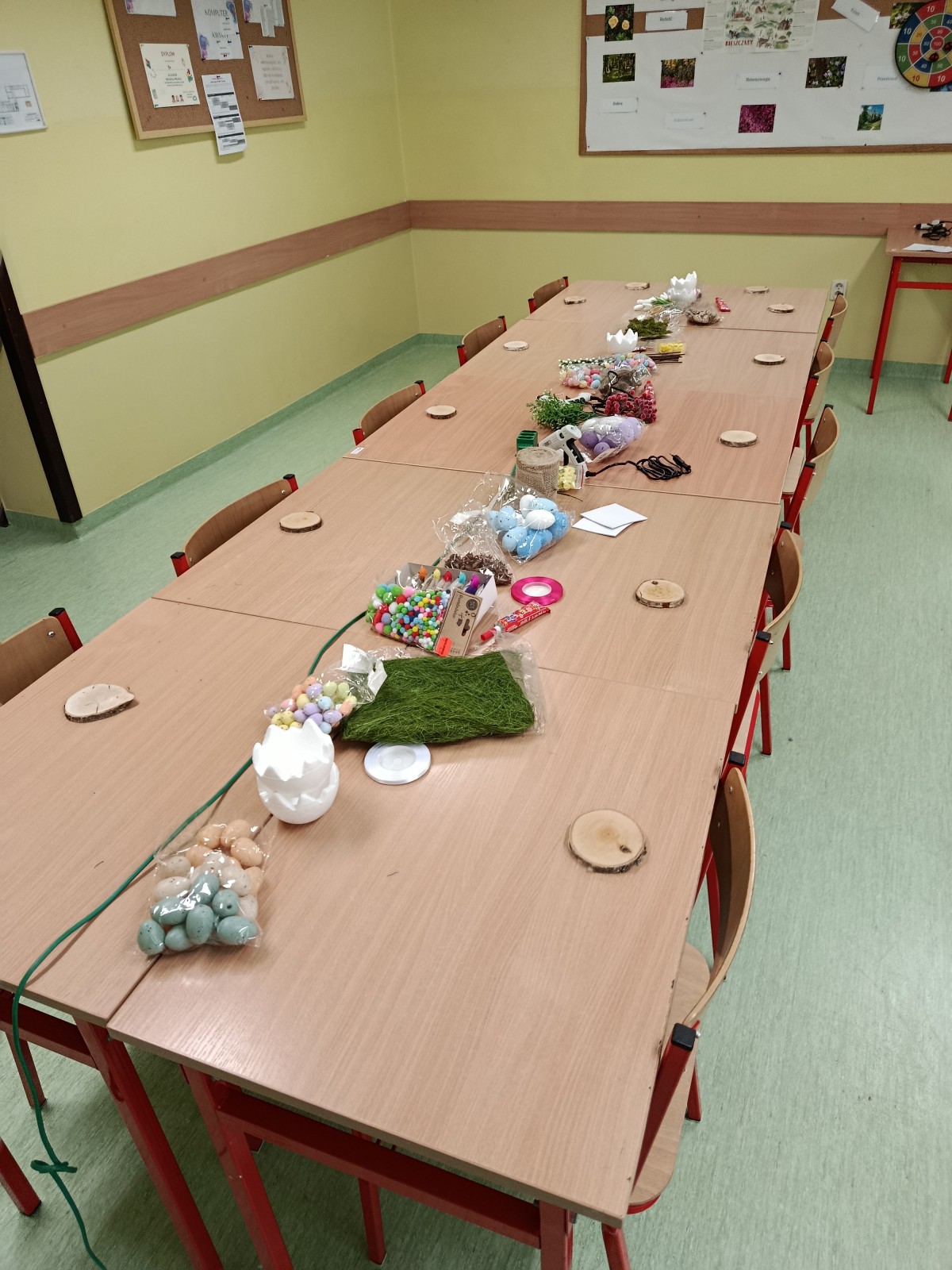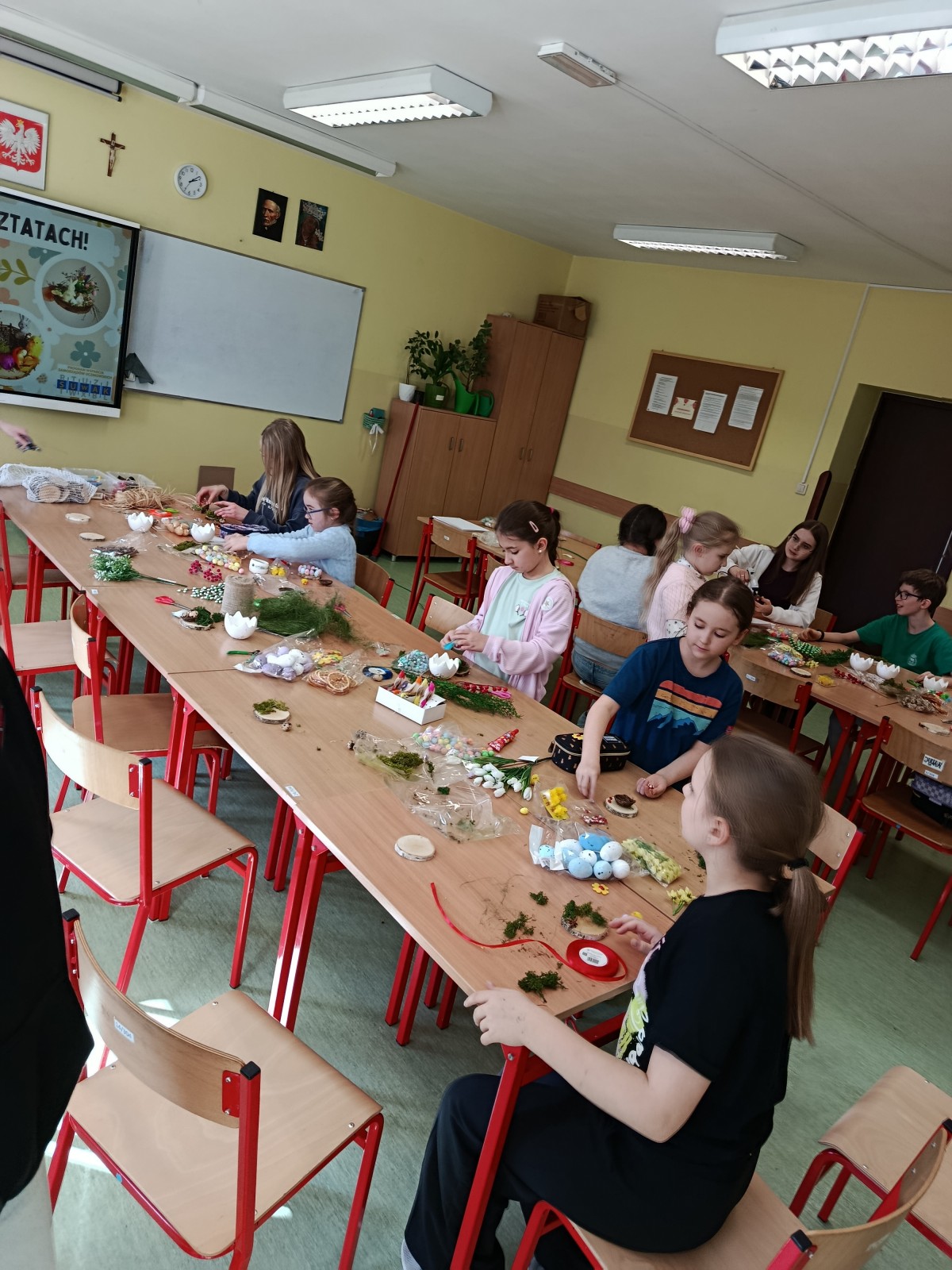 Projekt miał swoje dwie odsłony. Pierwszą był szkolny konkurs na najpiękniejszą kartkę wielkanocną, w której udział wzięło aż 41 uczniów. Wszyscy uczestnicy otrzymali nagrody, a pokonkursowe kartki zostały przekazane na cele charytatywne: kiermasz wielkanocny, organizowany w naszej szkole, oraz do pacjentów szpitali na terenie Krakowa. Drugim punktem programu była organizacja warsztatów ozdób świątecznych dla dzieci z klas 3-4, przebywających na świetlicy. Warsztaty odbyły się 13 marca. Uczniowie z młodszych klas pod okiem starszych, bardziej doświadczonych wolontariuszy przygotowywali stroiki i ozdoby wielkanocne, przy okazji poznając zasady działania Szkolnego Koła Wolontariatu. Współpraca starszych z młodszymi okazała się być bardzo owocna, ponieważ w ciągu godziny wykonaliśmy ok. 45 stroików, które również zostały przekazane na szkolny kiermasz charytatywny. Uczestnicy warsztatów otrzymali w podziękowaniu drobne upominki.