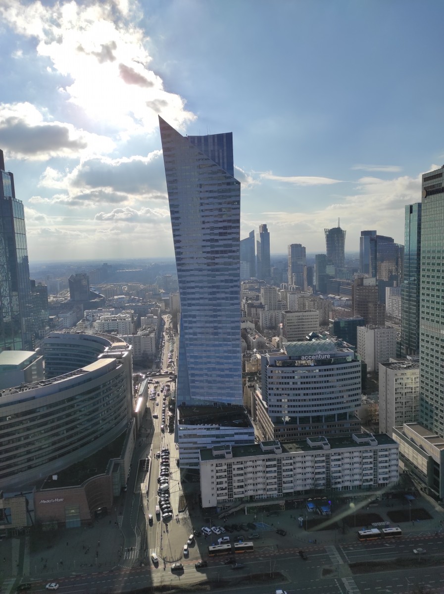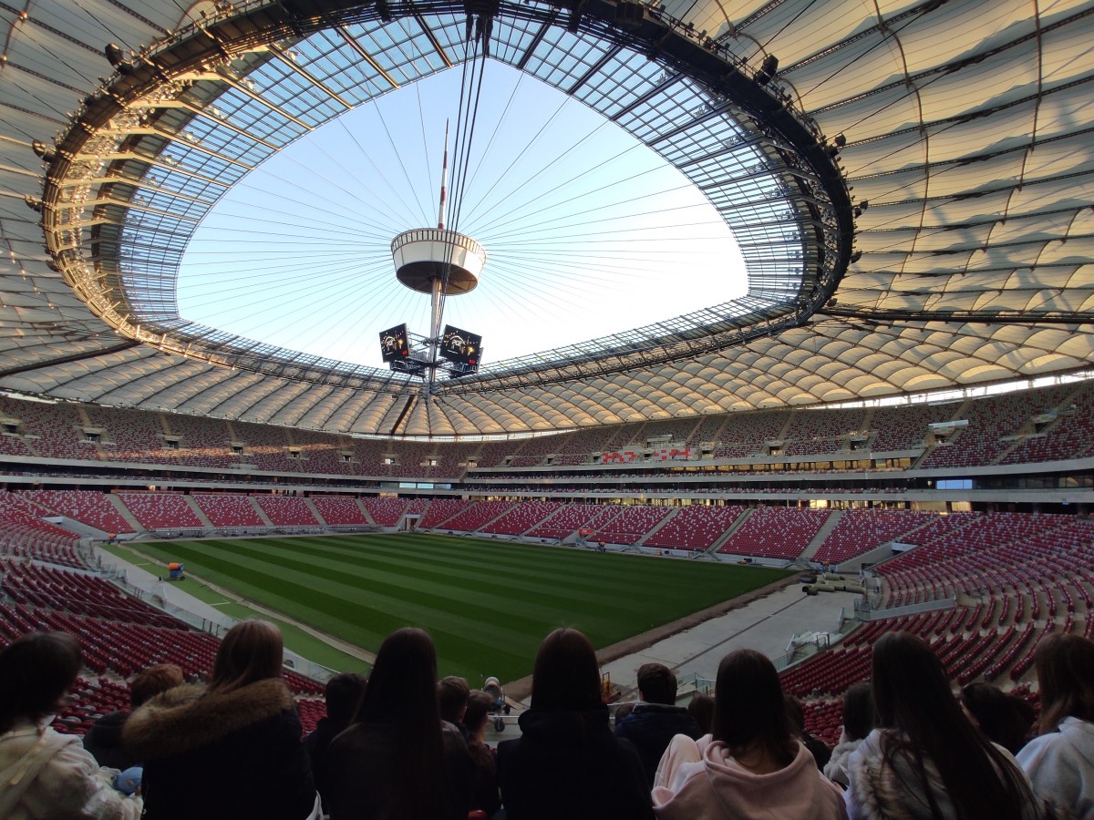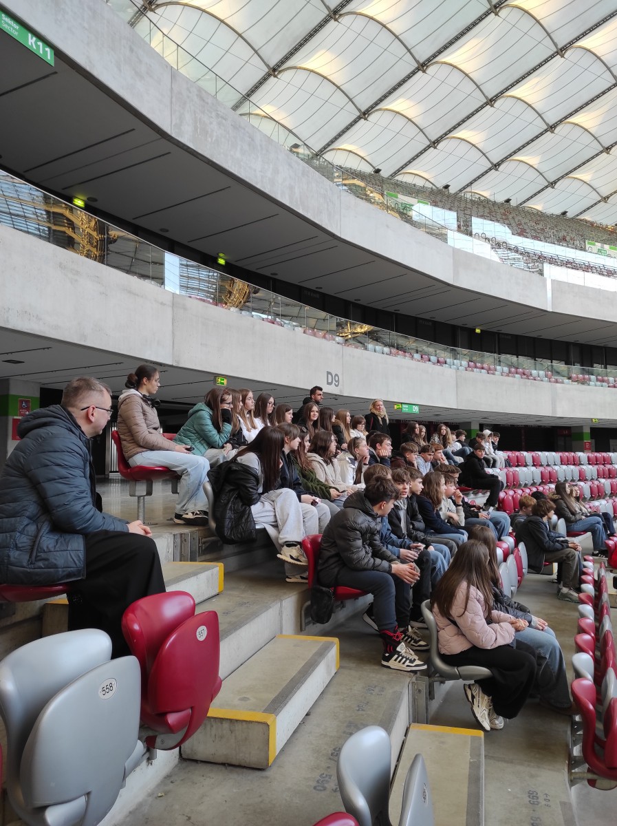 Po tym spotkaniu przeszliśmy do sanktuarium na drogę krzyżową. Rozważanie były bardzo poważne i, jeżeli wolno mi tak powiedzieć, głębokie. Następnie uczestniczyliśmy w Eucharystii. Homilię, znakomicie tłumaczoną przez o. Jacka Wolana, wygłosił o. Carlas Gil, Generał Zakonu Pijarów. Jego słowa były pełne nadziei i optymizmu. Po Mszy wróciliśmy do budynku szkoły i zjedliśmy ciepły posiłek. Wsiedliśmy do autokaru i pojechaliśmy zobaczyć panoramę miasta z wyjątkowego miejsca - tarasu widokowego na trzydziestym piętrze Pałacu Kultury i Nauki. Widok zapierał dech w piersiach. Następnym punktem na naszej mapie był PGE Narodowy, prawdziwa gratka dla fanów wszystkich sportów - pani przewodnik powiedziała nam, że na stadionie odbywają się rozgrywki w wielu dziedzinach. Byliśmy na trybunie, w szatniach i małym muzeum. Na zakończenie zwiedzania weszliśmy na płytę. Zmęczeni (o 17:30 byliśmy na nogach już 13 godzin!) pojechaliśmy do hotelu. To był moment, w którym mogliśmy doświadczyć warszawskiej codzienności - staliśmy w korku kilkanaście minut. Kiedy w końcu dotarliśmy do celu, obrabowaliśmy recepcję z cukierków i zjedliśmy kolację. Wieczorny czas wolny spędziliśmy na międzyklasowej integracji.