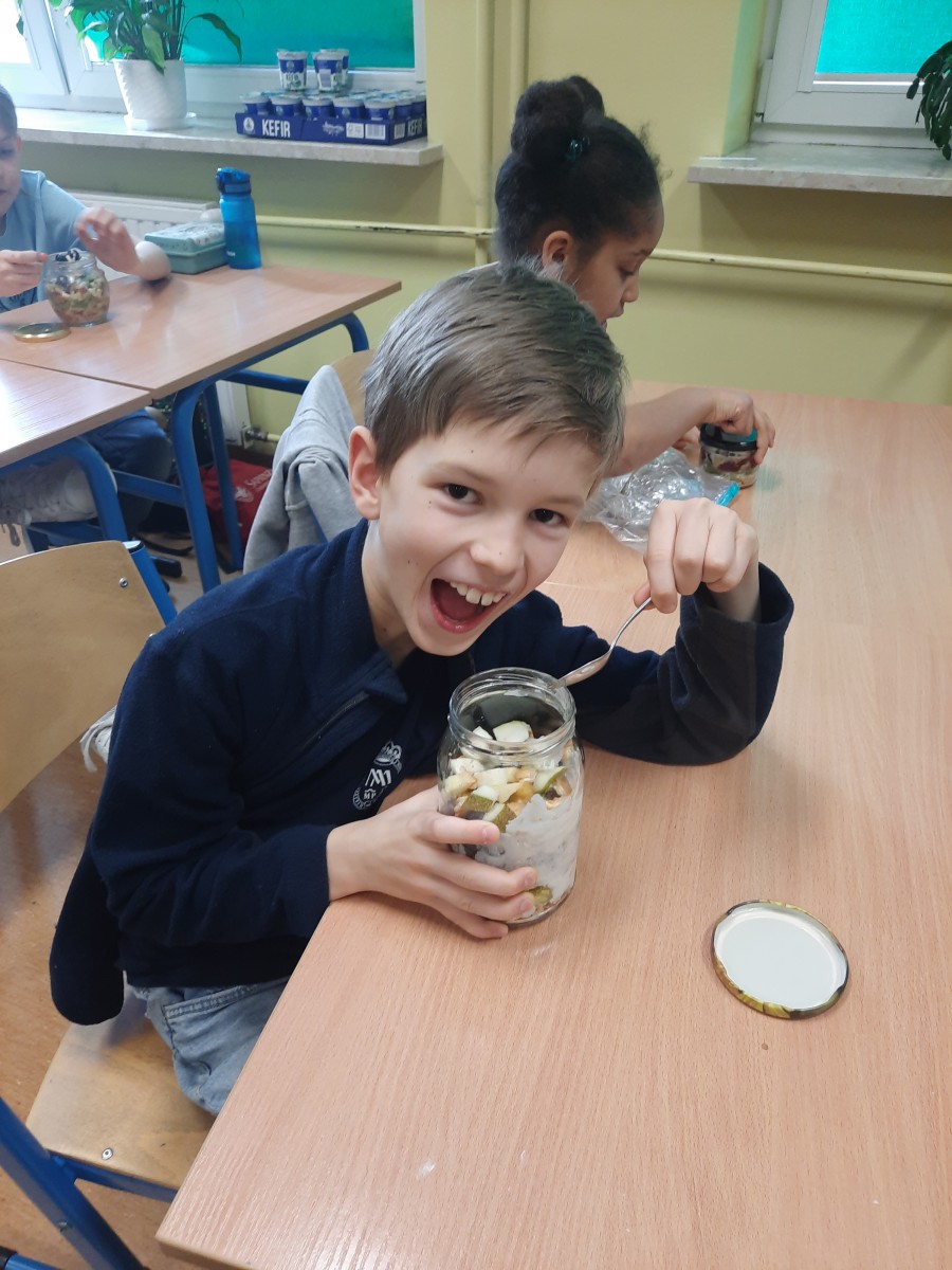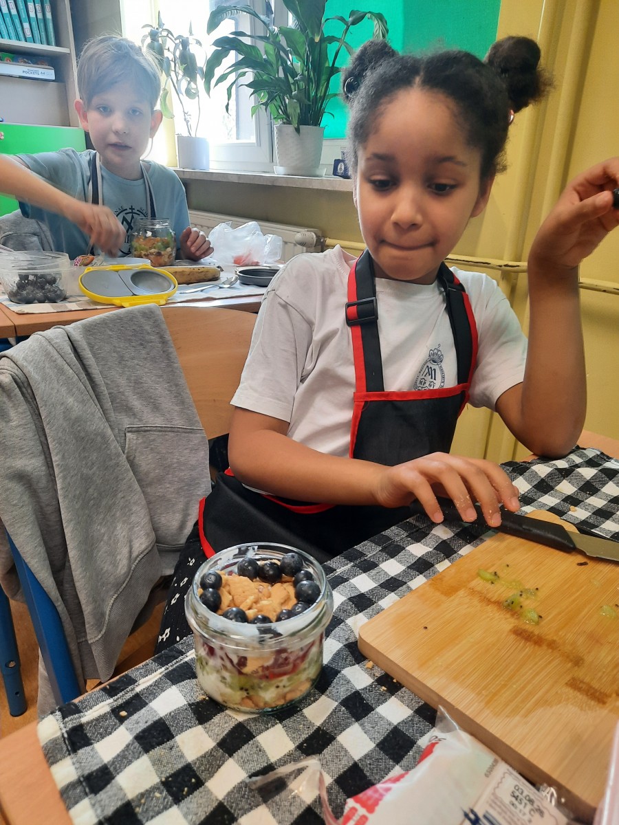 Podczas pracy uczniowie doskonalili umiejętność bezpiecznego posługiwania się akcesoriami kuchennymi oraz dbali o estetykę podania. Warsztaty zakończyły się wspólną degustacją.