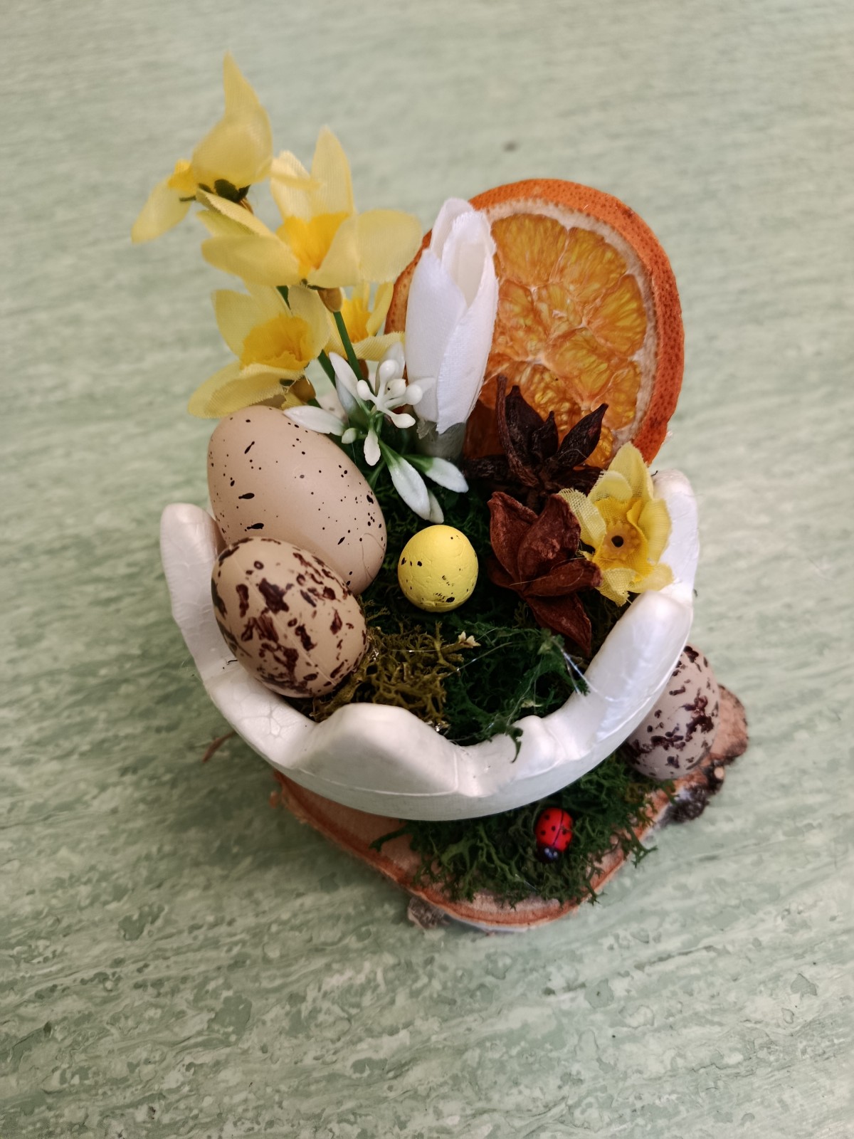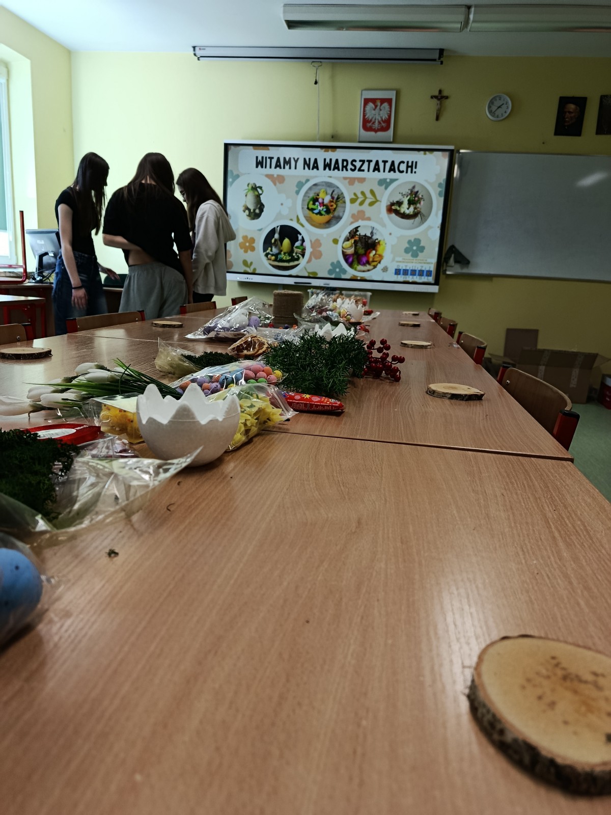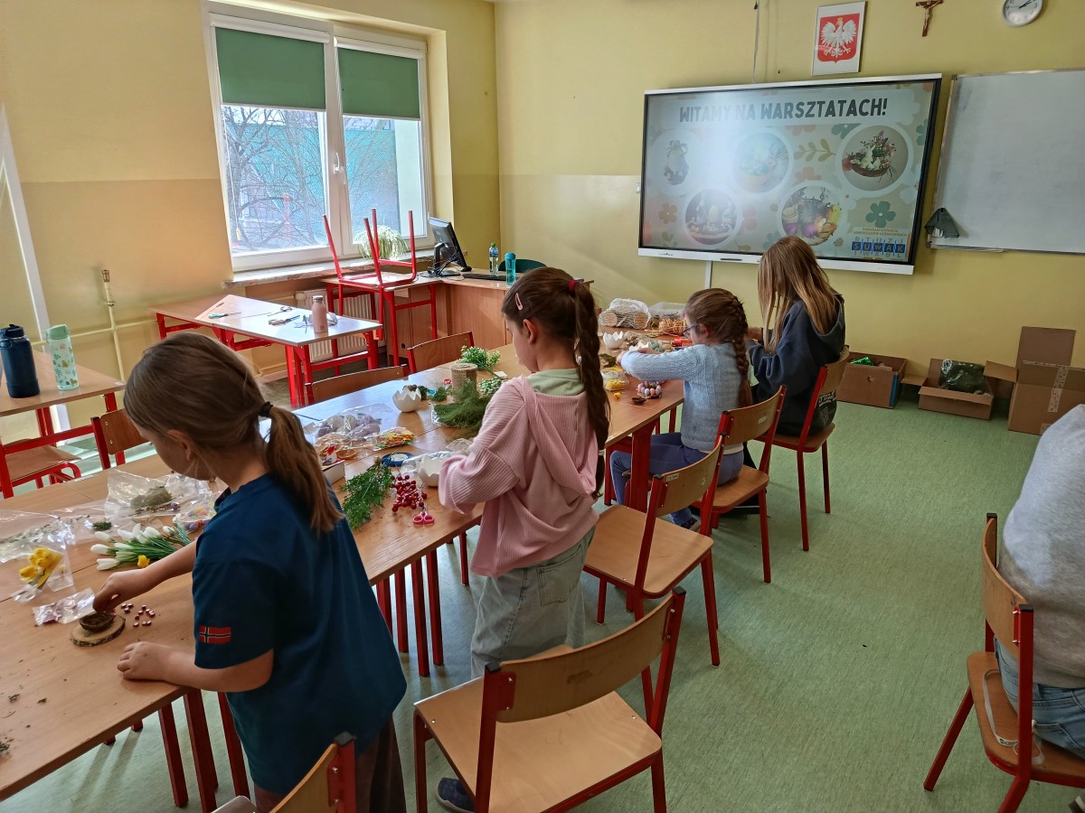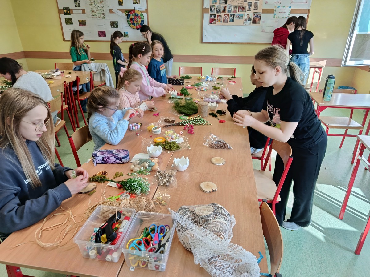 Projekt miał swoje dwie odsłony. Pierwszą był szkolny konkurs na najpiękniejszą kartkę wielkanocną, w której udział wzięło aż 41 uczniów. Wszyscy uczestnicy otrzymali nagrody, a pokonkursowe kartki zostały przekazane na cele charytatywne: kiermasz wielkanocny, organizowany w naszej szkole, oraz do pacjentów szpitali na terenie Krakowa. Drugim punktem programu była organizacja warsztatów ozdób świątecznych dla dzieci z klas 3-4, przebywających na świetlicy. Warsztaty odbyły się 13 marca. Uczniowie z młodszych klas pod okiem starszych, bardziej doświadczonych wolontariuszy przygotowywali stroiki i ozdoby wielkanocne, przy okazji poznając zasady działania Szkolnego Koła Wolontariatu. Współpraca starszych z młodszymi okazała się być bardzo owocna, ponieważ w ciągu godziny wykonaliśmy ok. 45 stroików, które również zostały przekazane na szkolny kiermasz charytatywny. Uczestnicy warsztatów otrzymali w podziękowaniu drobne upominki.